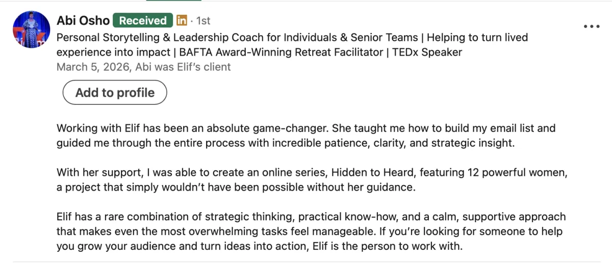 "The strategies Elif shares are GOLD! If you want visibility, confidence, practical tips she is the women to be with. She pours her heart"